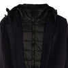 GIACCONE CON CAPPUCCIO, IN TESSUTO TECNO SOFT SHELL, IMBOTTITO NON TRAPUNTATO. CHIUSURA CON CERNIERA. FODERA TRAPUNTATA ORIZZONTALMENTE IN NYLON LUCIDO. FINTO GILET, FISSO, CON CAPPUCCIO ALL'INTERNO DEL CAPO IN TESSUTO NYLON. CAPPUCCIO CON VISIERA IMPUNTURATA E POLSI IN COSTA. FONDO DEL RETRO PIÙ LUNGO DEL DAVANTI E LEGGERMENTE STONDATO. BRETELLE STACCABILI PERSONALIZZATE, CHE PERMETTONO DI INDOSSARE IL CAPO COME SE FOSSE UNO ZAINO. IMBOTTITURA OVATTA PESANTE (GR.250 CIRCA).